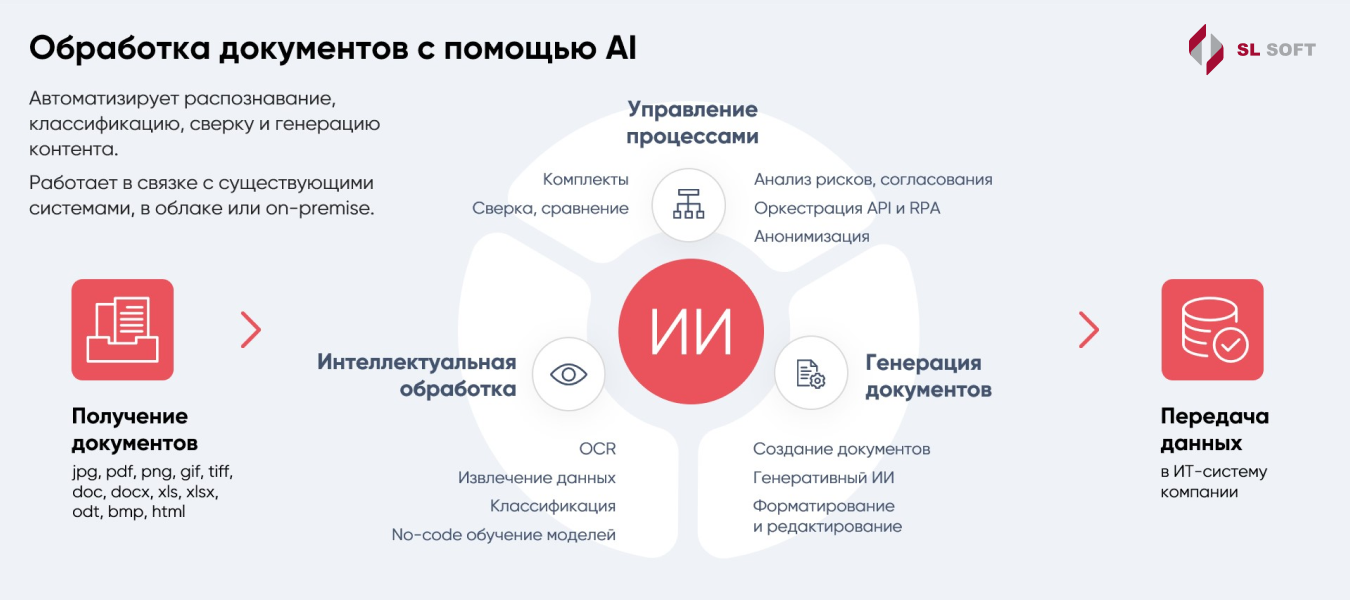 IDP-сервис SL Soft AI — быстрый способ повышения эффективности ИТ-ландшафта с помощью искусственного интеллекта. Сервис «встраивается» в цифровую инфраструктуру компании, извлекает значимые данные из документов любых форматов, структурирует их и запускает цепочку автоматических действий. Это мост от документа к решению или действию.
