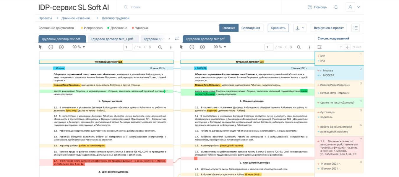 - Сравнение версий документов. IDP-сервис автоматически находит отличия: что было добавлено, удалено или изменено. Выделяет расхождения, формирует отчет, оценивает критичность правок. Это помогает упростить проверку документов и снизить финансовые риски.