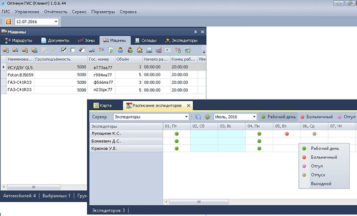 Модуль «Расписание экспедиторов» помогает логисту составлять график работы водителей-экспедиторов на неделю, месяц и т.д., отмечая рабочие, выходные, больничные, отпускные дни. Впоследствии эти данные используются при автоматическом расчете маршрутов доставки.