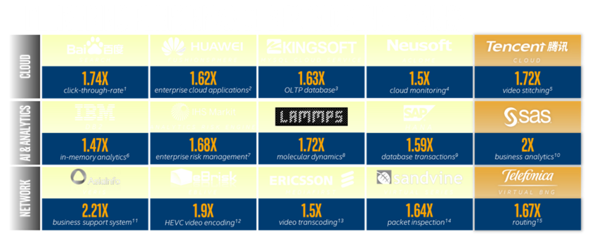 Платформа обеспечивает максимальную синергию всех элементов вычислительной системы и позволяет добиться максимальной производительности для поддержки тяжелых нагрузок, таких как сложная аналитика, машинное обучение, искусственный интеллект и обработка огромных объемов данных. Согласно тестам, проведенным ведущими компаниями, Intel Purely показала рост производительности корпоративных облачных приложений Huawei в 1,62 раза, бизнес-аналитики SAS в 2 раза, аналитических систем IBM в 1,47 раза, кодирования видео в Ericsson в 1,5 раза. С каждым днем количество рекордов новой платформы продолжает расти. Intel Xeon Scalable уже оценены такими компаниями как Amazon, AT&T, Google, Microsoft, Montefiore, Technicolor и Telefonica. Продукты новой серии уже используются при оснащении ЦОД, например, компаниями «Селектел» и РСК.