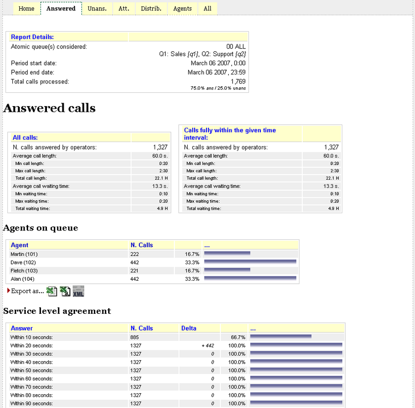 Наличие детальной информации по вызовам позволяет системе строить статистические отчеты о работе колл-центра на различных временных интервалах с данными: