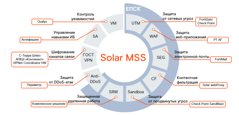 По информации компании, концепция Solar MSS была создана на базе практического опыта реализации нескольких сотен проектов по направлению Единой платформы сервисов кибербезопасности (ЕПСК). На июль 2019 года экосистема Solar MSS включает 9 взаимоинтегрированных управляемых сервисов кибербезопасности, технологическим ядром которых является Единая платформа сервисов кибербезопасности (ЕПСК), построенная на прорывной технологии программно-определяемы по угрозам и атакам, что позволяет непрерывно совершенствовать технологии и политики безопасности каждого из них.