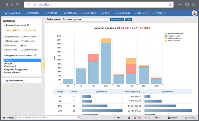 В составе Yoolla CRM имеется более 50 различных отчетов по различным аспектам деятельности отдела продаж. Воронка продаж, Выполнение личного плана, Воронка активности, Рейтинги сотрудников и пр.