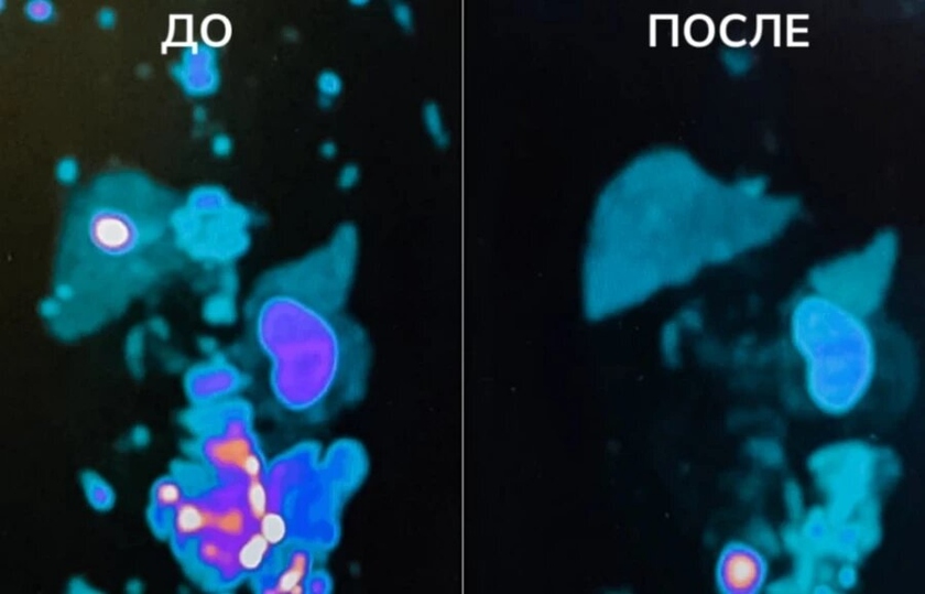 До использования этого инновационного метода у пациента были обнаружены метастазы в печени, лимфоузлах и костной ткани. Все они собирали в себе ПСМА-лиганд — молекулы, которые состоят из остатков аминокислот, связывающиеся с мембранами клеток рака простаты и доставляющие к ним изотоп с целью либо диагностики, либо терапии.