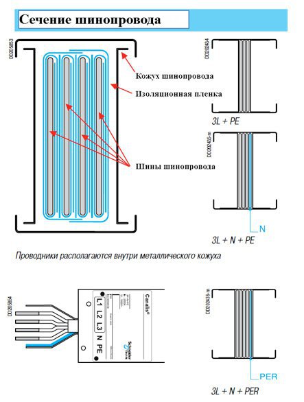 Конструкция большинства шинопроводов представляет собой пакет шин, плотно прижатых друг к другу, изолированных при помощи полиэфирной пленки и помещенных в кожух. Шины изготавливаются из меди или алюминия прямоугольной формы. Кожух, в зависимости от производителя, может быть алюминиевый или стальной.