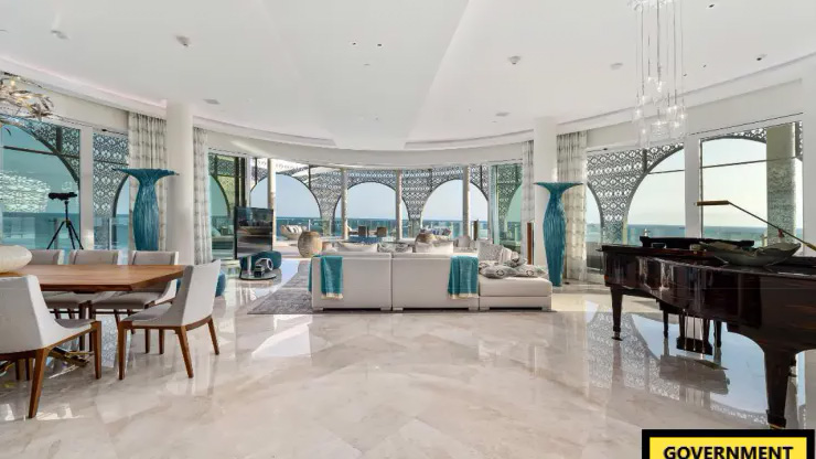 На представленных фотоснимках запечатлен роскошный интерьер пентхауса. Можно видеть зоны отдыха, в том числе с бассейном, несколько обеденных групп, террасу, которая опоясывает жилище по периметру. Пентхаус оборудован многочисленными ванными комнатами, гардеробными, собственным спа-центром и джакузи. Стены отделаны дорогостоящей венецианской штукатуркой, а полы — итальянским мрамором. Из окон открывается вид на бухту с шикарными яхтами и Атлантический океан.