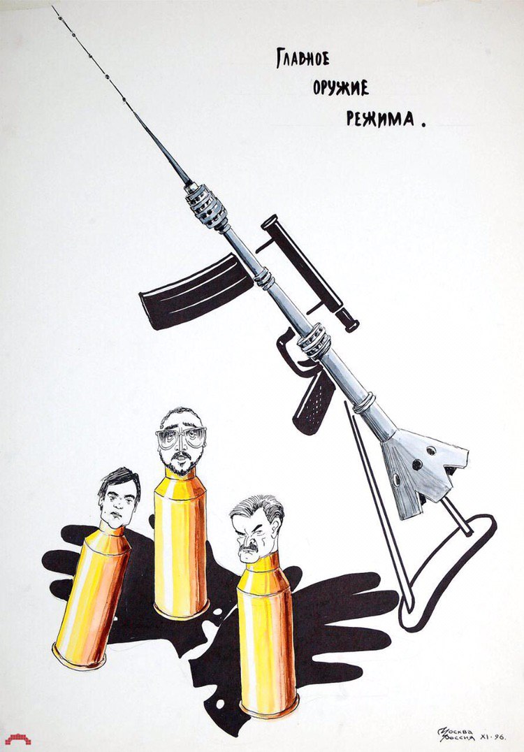 Каррикатура Д. Агаева "Главное оружие режима", ноябрь 1996 года. "Патроны" - Константин Эрнст, Сванидзе, Дмитрий Киселев.