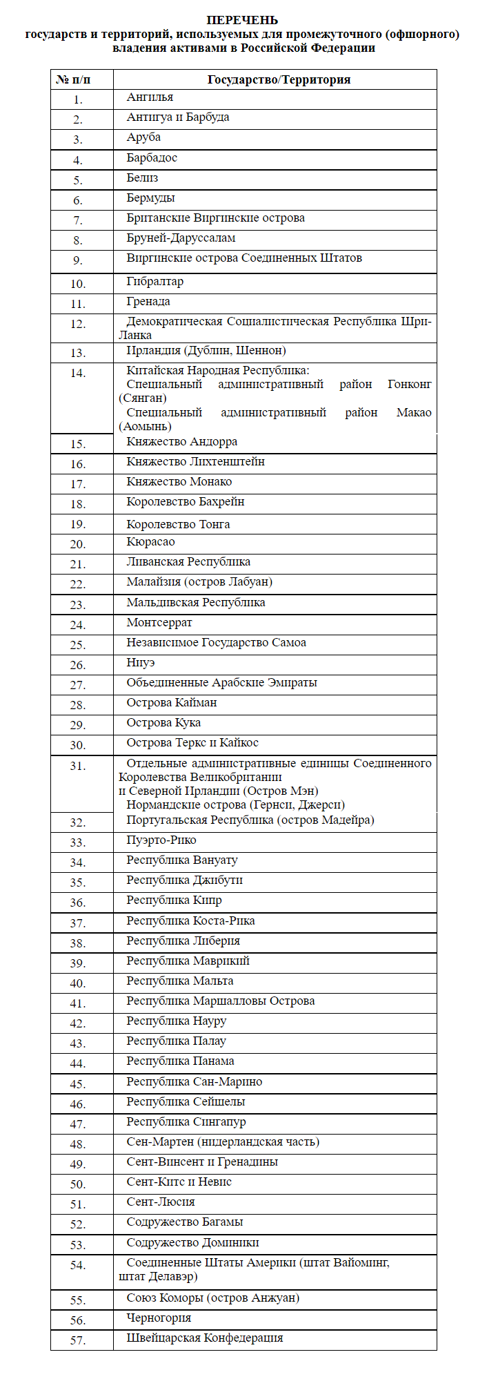 Список содержит 57 стран, среди которых - Кипр и Мальта. Кроме того, в него вошла Швейцарская Конфедерация, с которой Минфин РФ вел переговоры на предмет соглашения об избежании двойного налогообложения.