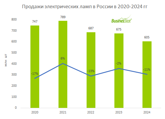 Продажи электрических ламп всех типов в России в 2024 году снизились на 11% по сравнению с предыдущим годом и составили 605 млн штук против 675 млн штук в 2023 году. За пятилетний период с 2020 по 2024 годы общее сокращение рынка достигло 19% с базового уровня 747 млн штук. Данные опубликованы в исследовании компании BusinesStat в июле 2025 года.
