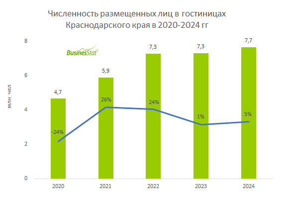 - ↑ В 2020-2024 гг численность постояльцев гостиниц в Краснодарском крае увеличилась на 64%: с 4,7 до 7,7 млн человек.