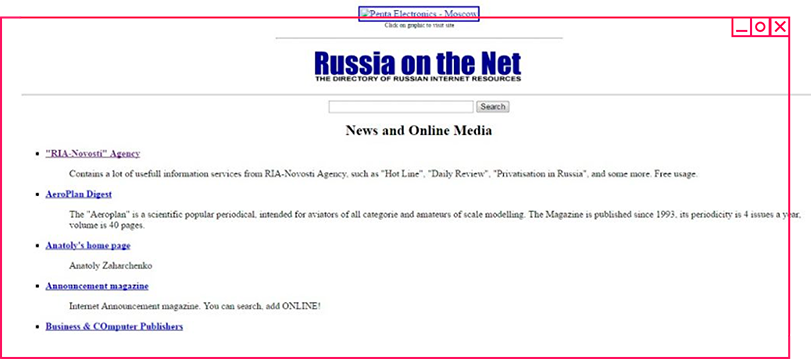 Первое десятилетие Рунета – это время, наполненное событиями с приставкой «впервые». В первые годы этой декады в Сети появилась первая электронная библиотека, основанная программистом Максимом Мошковым, первый веб-ресурс информационного агентства («РосБизнесКонсалтинг»), первая электронная версия СМИ – адрес «Учительской газеты» https://ug.ru/ с тех пор не менялся, первая в России студия веб-дизайна, основанная Артемием Лебедевым, и первый русскоязычный развлекательный портал www.anekdot.ru, здравствующий и поныне. Также в 1995 г. впервые в истории страны были опубликованы промежуточные результаты выборов депутатов в Государственную Думу РФ.